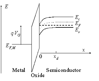The energy band diagram of an n-MOS capacitor biased in inversion is shown in Figure 6.2.3. The oxide is modeled as a semiconductor with a very large bandgap and blocks any flow of carriers between the semiconductor and the gate metal. The band bending in the semiconductor is consistent with the presence of a depletion layer. At the semiconductor-oxide interface, the Fermi energy is close to the conduction band edge as expected when a high density of electrons is present. The semiconductor remains in thermal equilibrium even when a voltage is applied to the gate. The presence of an electric field does not automatically lead to a non-equilibrium condition, as was also the case for a p-n diode with zero bias. |