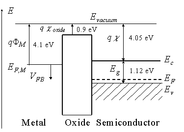 The flatband diagram is by far the easiest energy band diagram. The term flatband refers to fact that the energy band diagram of the semiconductor is flat, which implies that no charge exists in the semiconductor. The flatband diagram of an aluminum-silicon dioxide-silicon MOS structure is shown in Figure 6.2.4. Note that a voltage, VFB, must be applied to obtain this flat band diagram. Indicated on the figure is also the work function of the aluminum gate, FM, the electron affinity of the oxide, coxide, and that of silicon, c, as well as the bandgap energy of silicon, Eg. The bandgap energy of the oxide is quoted in the literature to be between 8 and 9 electron volt. The reader should also realize that the oxide is an amorphous material and the use of semiconductor parameters for such material can justifiably be questioned. |